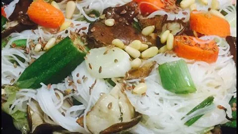 Ingredients: Rice noodles, Shitake Mushrooms, Onions, Carrots, Pine nuts, Flax seeds, Okra